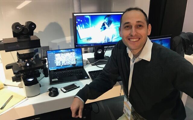 Augmentiqs co-founder Gabe Siegel looking into the microscope in at the HealthIL exhibit in Tel Aviv. Nov. 27, 2019 (Shoshanna Solomon/Times of Israel)