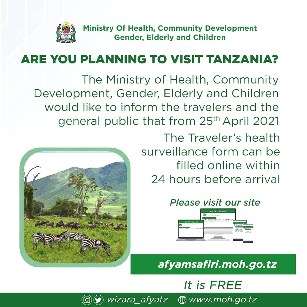 The Ministry of Health, Community Development, Gender, Ederly and Children would like to inform the travelers and the general public that from 25th April 2021, the Traveler's Health Surveillance Form can be filled online within 24 hours before arrival at: afyamsafiri.moh.go.tz.