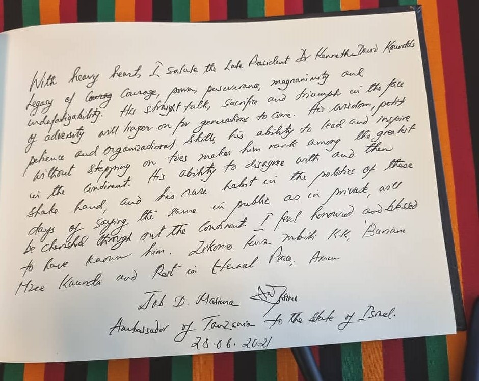 H.E. Job Daudi Masima, Ambassador of the United Republic of Tanzania paid his last homage to H.E. Dr. Kenneth Kauda by signing the Book of Condolence at the Embassy of the Republic of Zambia.