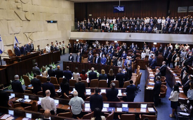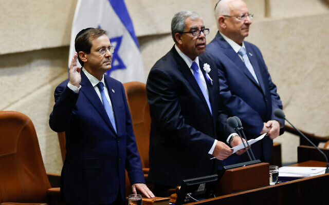 Newly elected Israeli President Isaac Herzog is sworn in at the Israeli Parliament in Jerusalem, on July 7, 2021. (Yonatan Sindel/FLASH90)