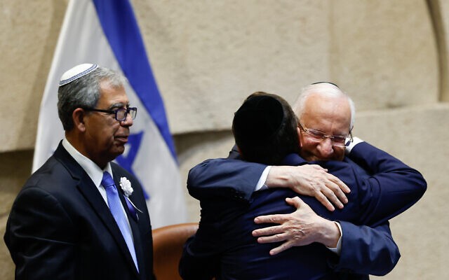 Newly sworn in President Isaac Herzog, center, embraces his predecessor, Reuven Rivlin, in Jerusalem, on July 7, 2021. (Yonatan Sindel/FLASH90)