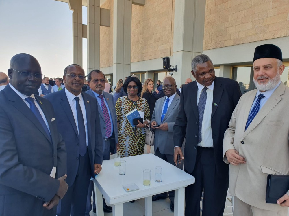 From left to right: H.E. Mr. Wol Mayar Ariec, Ambassador of the Republic of South Sudan, H.E. Mr. Samuel Hg'ang'a Thuita, Ambassador of the Republic of Kenya, H.E. Mr. Osvaldo dos Santos Varela, Ambassador of the Republic of Angola, H.E. Ms. Hannah Ama Nyarko, Ambassador of the Republic of Ghana, H.E. Mr. Martin Mwanambale, Ambassador of the Republic of Zambia, H.E. Mr. Job Daudi Masima, Ambassdor of the United Republic of Tanzania, Mr. Muhammad Sharif Odeh, President of the Ahmadiyya Muslim Community in Israel