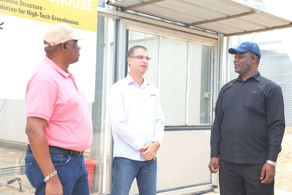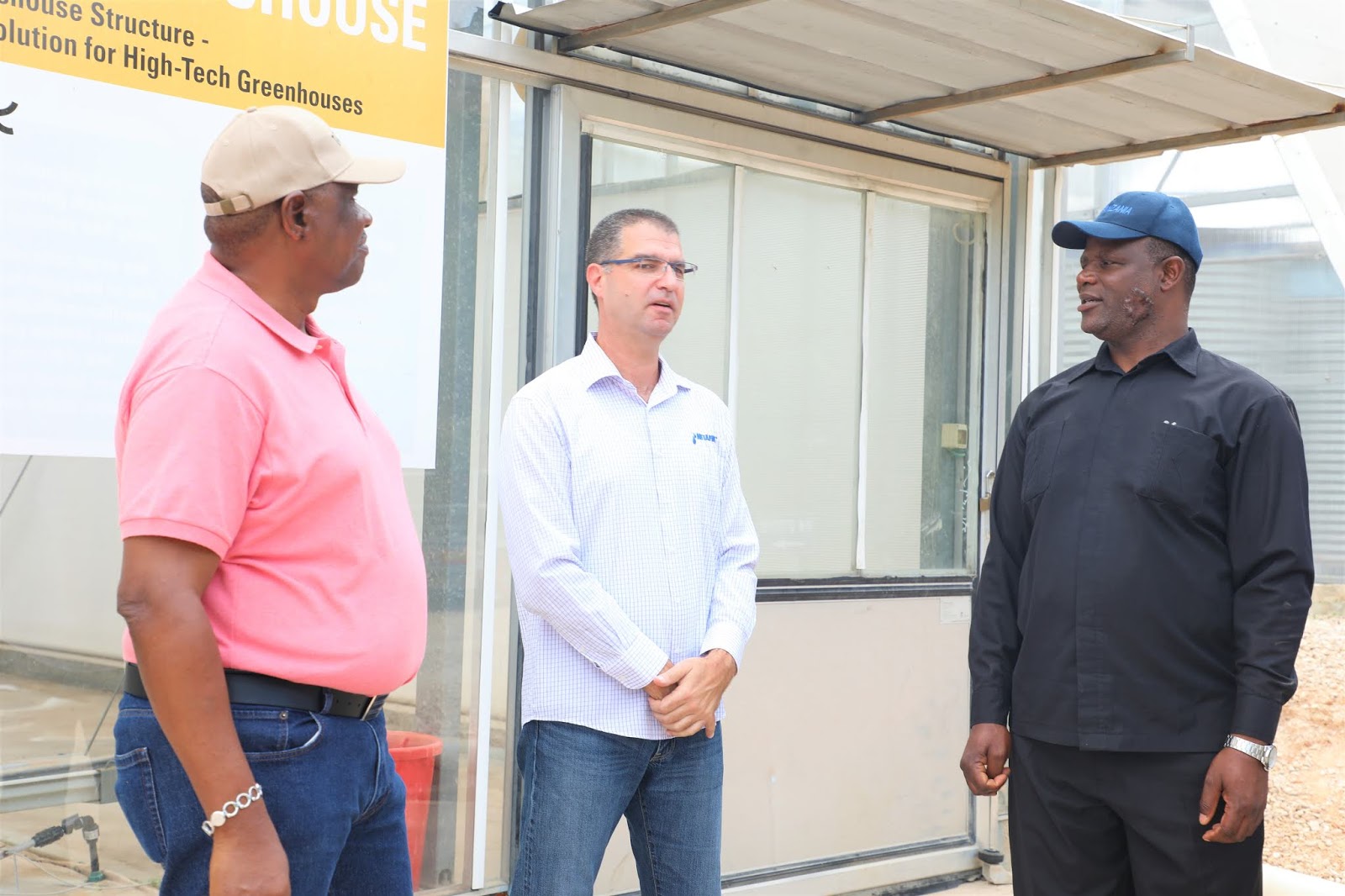 The Tanzanian Minister of Agriculture, Japhet Hasunga (right) discussing with Mr. Shay Haxter, Head of Project Africa, Netafim during a visit to the Agricultural Research Center accompanied by Amb. Job Daudi Masima (left).